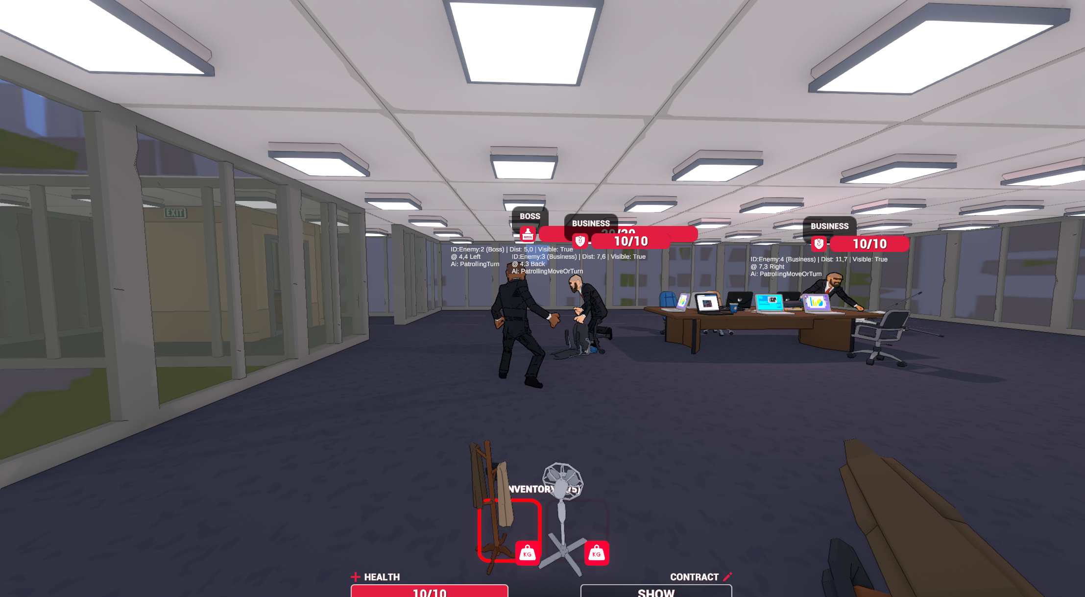 Take all object that you can and throw them or use them to go to the 5th floor and beat the big manager and the unionized organization.